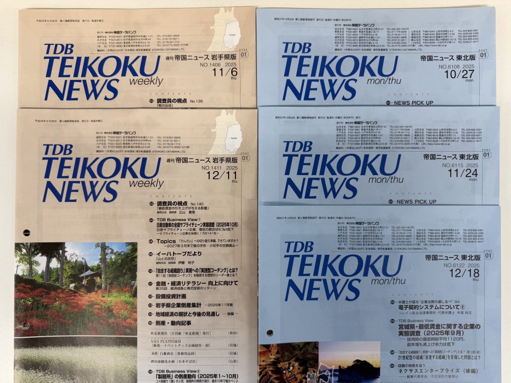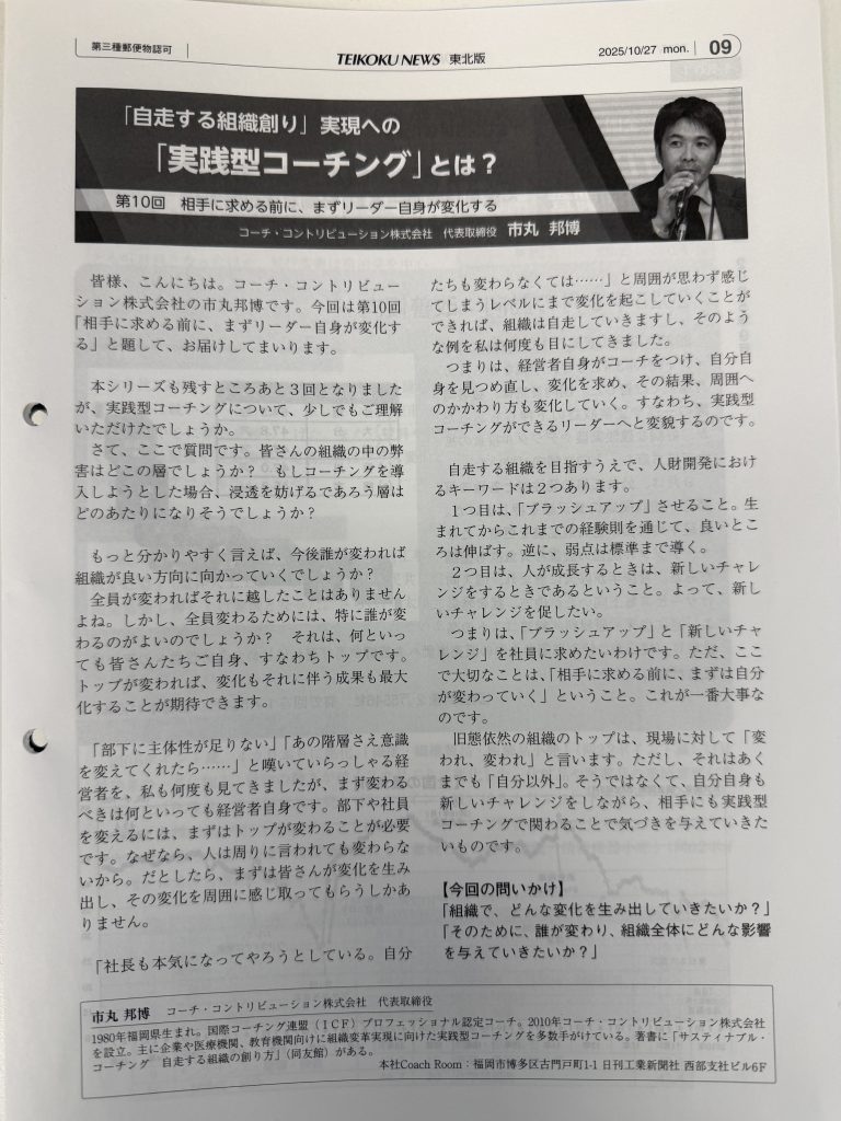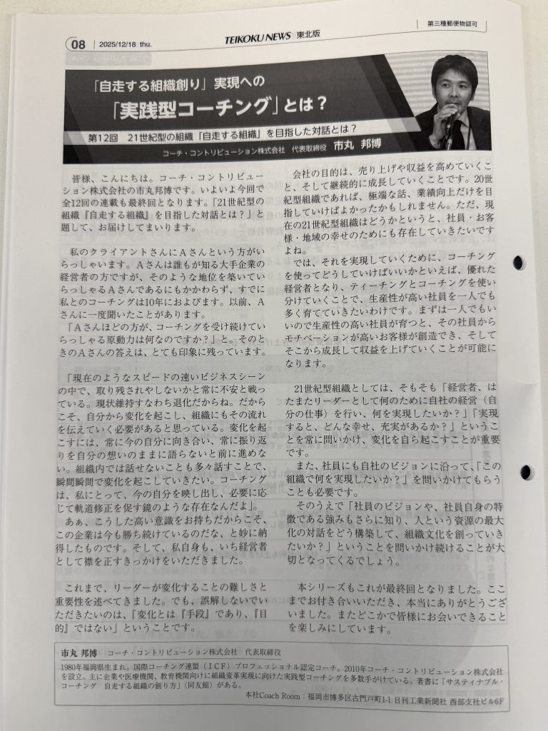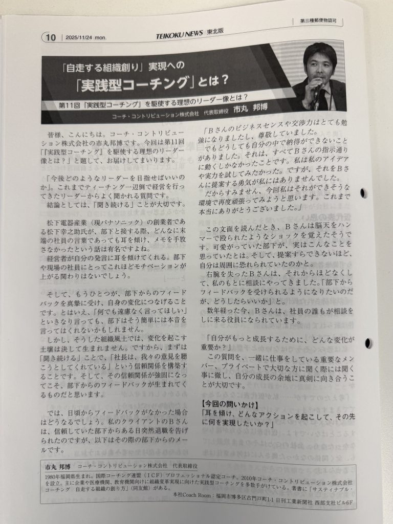 このたび、【帝国ニュース東北版(2025年10月27日号、11月24日号、12月18日号)】【帝国ニュース岩手県版(2025年11月6日号、12月11日号】に弊社の「実践型コーチング」に関する記事が掲載されましたので、お知らせいたします。